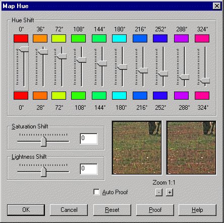 You're driving down a back road on a beautiful fall day and you spot a lovely scene. Horses graze in a pasture, a barn off in the misty distance, and perfect white fences to add order and foreground interest to the scene. You pull over and grab your camera out of the back seat and walk up to the fence. One of the horses even obliges by making eye contact with you as you take the shot. But as so often happens, when the slide comes back from the processor all is not well. The scene is as you remember it in the viewfinder but the harsh late morning sun has left the image looking a little flat. While it's sharp from the foreground until it fades into the misty distance it's just lacking that something to really make it sing. You confine the slide to your "almost pile" and sigh, wishing you had had an enhancing filter along that morning. That, you think, would have made all the difference in this image. That's exactly what happened to me when I took the pastoral photo you see here. For those of you not familiar with them, an Enhancing filter is a unique color correction filter available from Tiffen. Unlike many filters, which leave an image looking as though it has been obviously filtered, an enhancing filter saturates reds, rust browns, and oranges while leaving the other colors in the spectrum unaffected. This means that whites stay white and greens stay green. While it is best known for adding punch to fall scenes it can be used for any number of applications including red barns in winter and scenes with a lot of earth tones. The only side effect to using an enhancing filter is that at some angles the sky can pick up a slightly magenta cast - though this is noticeable only if you're looking for it. That's all well and good but it doesn't much help my horse shot as I didn't have an enhancing filter with me that morning. I was going through my "almost" pile recently when I rediscovered the image in question. I could remember the morning I took the shot clearly and wished again for that filter. Then I realized that there was a way I could accomplish the same thing in Paint Shop Pro. After scanning the image to PhotoCD I loaded it into Paint Shop Pro. Standard operating procedure for scanned images calls for running a sharpening filter and slightly boosting saturation to get back to the image on the original slide. In less then a minute this was done and I had the original you see at the top of the page (you can click on any of the images to see more detail).