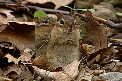 Many folks do not realize that the chipmunks also stay in their dens for extended times during the last part of July and most of August. This sleep period allows them to escape from the hottest weather and is known as estivation. Chipmunks are usually active from about 7:00 a. m. until about 11:00 a. m. at which time they den up until about 3:00 p. m. and then are active until dark. Most rural areas have lots of chipmunks if there are no cats in the immediate area. Hawks, weasels and snakes all feed upon chipmunks, but the house cat has to be their number one nemesis. My home is a nature sanctuary and I have numerous bird feeders that are filled year round. Several years ago I live-trapped nineteen eastern chipmunks out of our garden that measures fifty feet by twenty feet. We couldn't keep seeds in the ground. The trapped chipmunks were released in old stone rows that are found through all the forests in my area. Chipmunk burrows are unique because they usually have only one entrance. The chipmunks dig the tunnels and pull and push all of the dirt out of the entrance hole and then scatter it. When the tunnel is dug up to the top of the earth, the exit hole has no dirt to betray its location because all of the dirt was taken out the entrance hole. The entrance hole is then packed solid, so it can no longer be used, and covered with leaves. The exit hole now becomes the entrance hole and is usually hidden by a leaf. As the hole is usually no larger than 1 ½", it is very difficult to see, especially when covered with a leaf or two. How do you find their burrows? Simple, just do as you have to do when working with all wildlife; sit down and just watch. Having a food source, as the chipmunks do at my feeders or at the bait you put out for them, they will promptly attempt to haul it all back to be stored in their burrows. Just follow them at a discrete distance and they will lead you right to their burrow. If you want to get pictures at their burrow, set your camera up on a Groofwin Pod to get it down to nearly ground level. Hook up a remote cord; move back and you are ready to shoot. To get the chipmunk to go in and out of the burrow frequently, put large bait just outside of the camera's viewpoint. Then you don't have to wait while the chipmunk makes a longer trip. Use large bait, such as corn or shelled peanuts so the chipmunk fills its pouches faster and returns sooner. The chipmunk usually pauses each time it comes out of its burrow; it usually just dives in when returning. If you want to get photos of the chipmunk searching for food among the leaves, use fine millet birdseed; they love it but, being so small, the seeds won't show in your photos and it will take the chipmunk longer to fill its pouches.