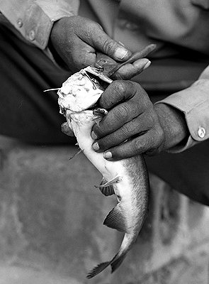 The old men were talking and chuckling as they prepared catfish for their supper. The hand shot is the least interesting of